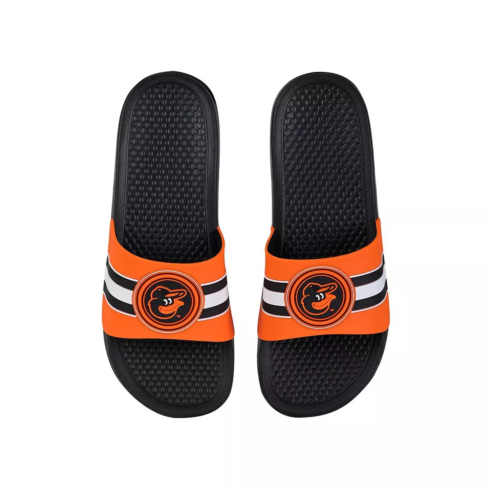 Keep your feet cool in hot weather by wearing these Baltimore Orioles Stripe Raised slide sandals from FOCO. They feature vivid Baltimore Orioles graphics, and the slip-on style makes them easy to use. The textured soles also help prevent you from slipping.