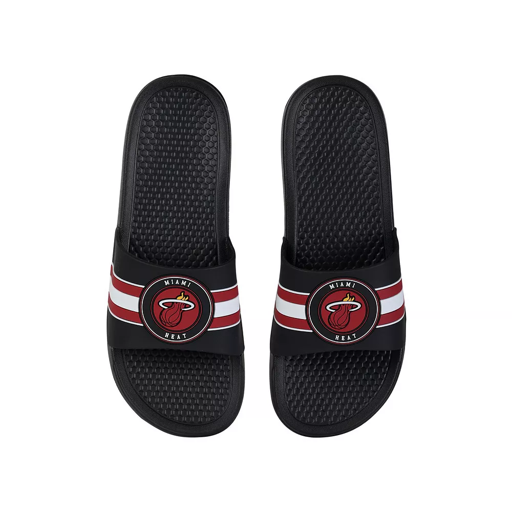 Keep your feet cool in hot weather by wearing these Miami Heat Stripe Raised slide sandals from FOCO. They feature vivid Miami Heat graphics, and the slip-on style makes them easy to use. The textured soles also help prevent you from slipping.