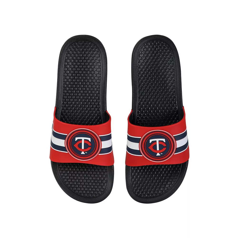 Keep your feet cool in hot weather by wearing these Minnesota Twins Stripe Raised slide sandals from FOCO. They feature vivid Minnesota Twins graphics, and the slip-on style makes them easy to use. The textured soles also help prevent you from slipping.