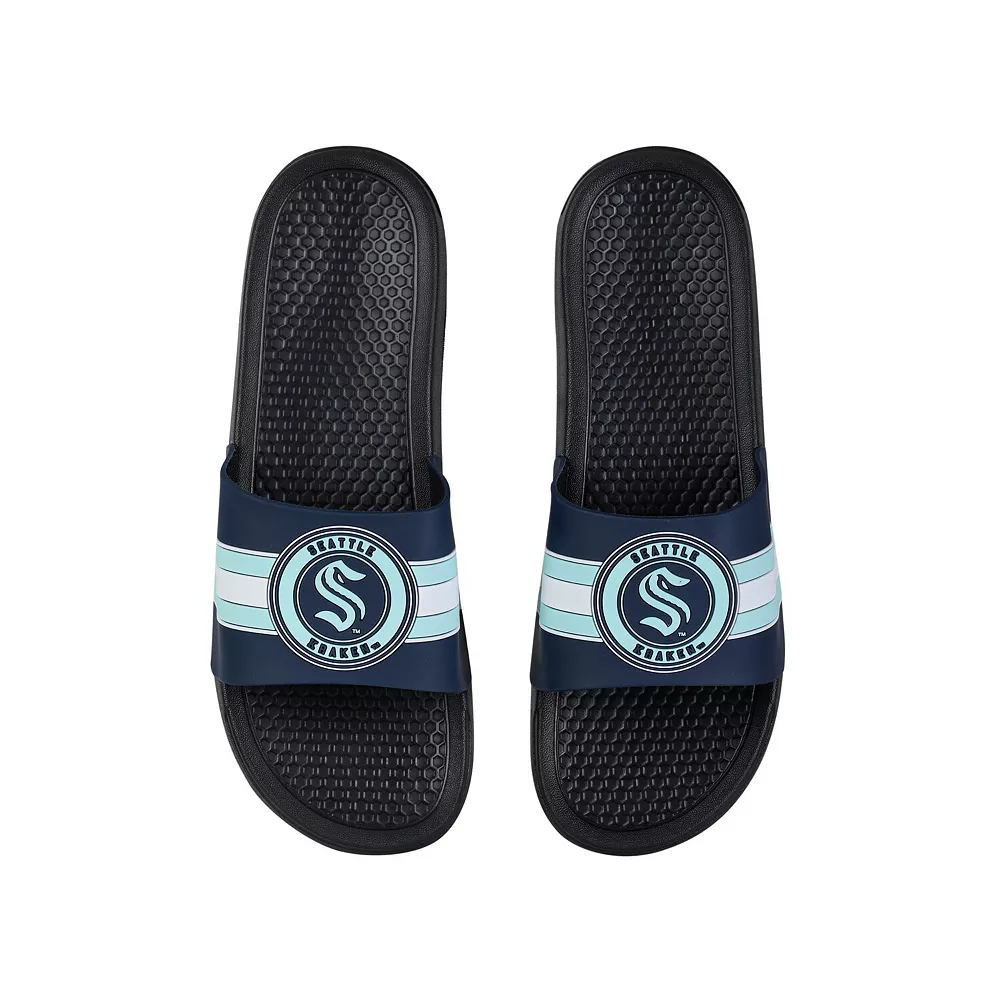 Keep your feet cool in hot weather by wearing these Seattle Kraken Stripe Raised slide sandals from FOCO. They feature vivid Seattle Kraken graphics, and the slip-on style makes them easy to use. The textured soles also help prevent you from slipping.